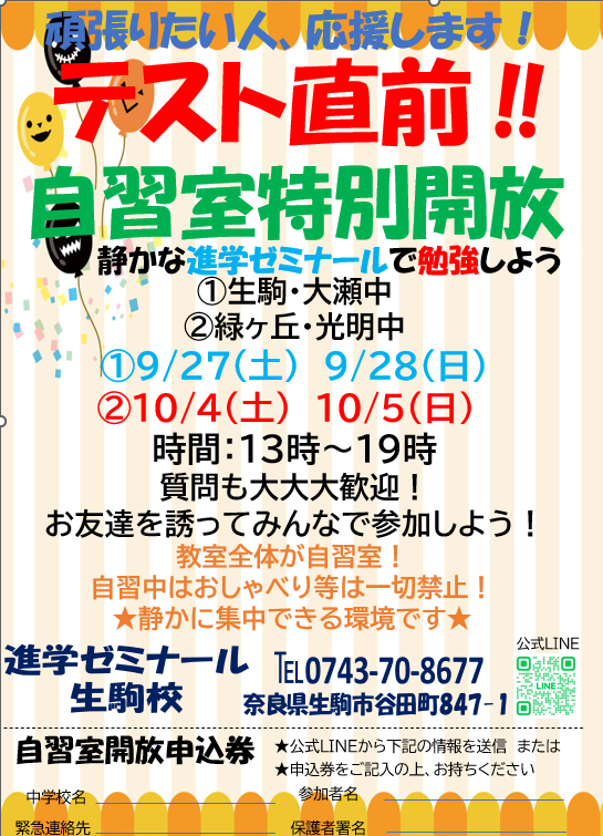 ⇩生駒校では中間テスト直前の土日を特別に開校いたします!⇩