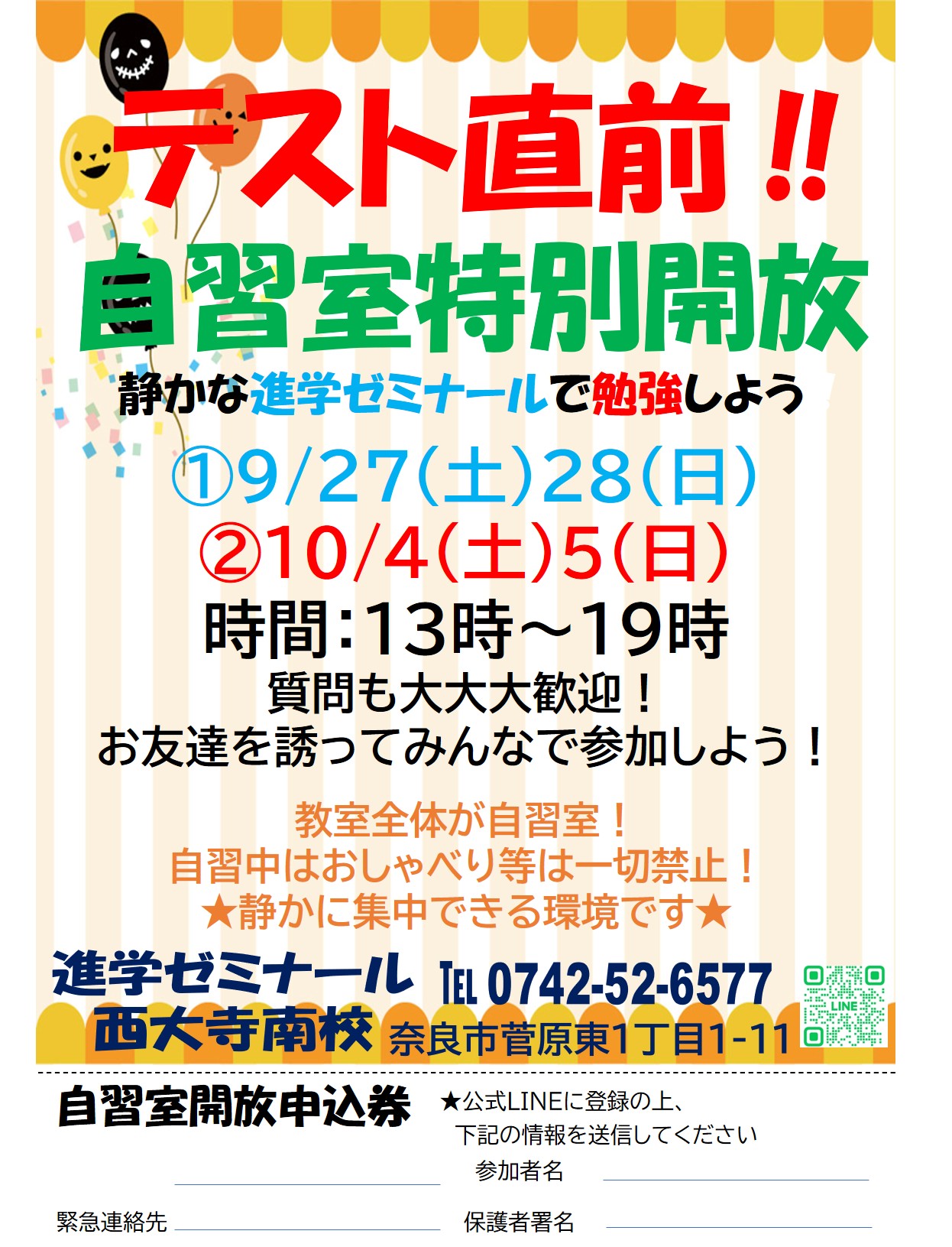 ⇩西大寺南校では中間テスト直前の土日を特別に開校いたします!⇩