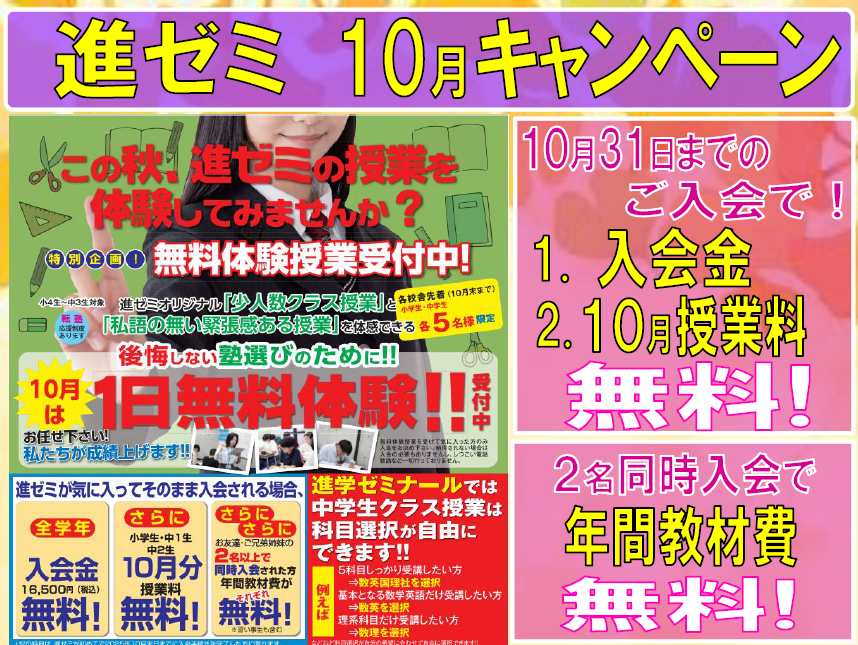 ホーム校舎ブログ【進学ゼミナール 西大寺南校】入塾をお考えの方へ♪10月の特別キャンペーン実施中!