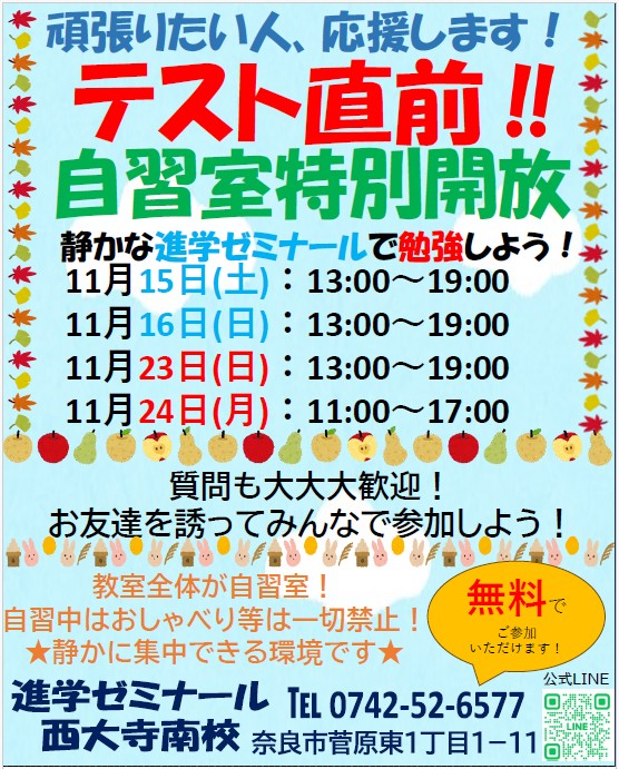 【進学ゼミナール西大寺南校】2学期期末テスト対策講座!無料で参加できます♪