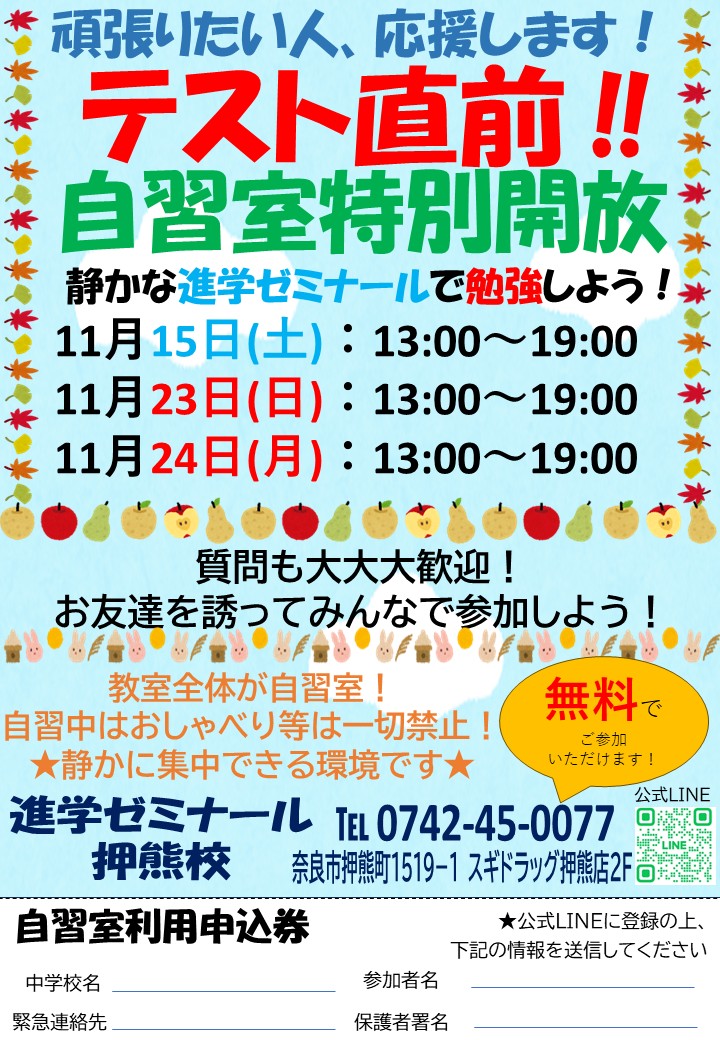 【進学ゼミナール押熊校】2学期期末テスト対策講座!無料で参加できます♪