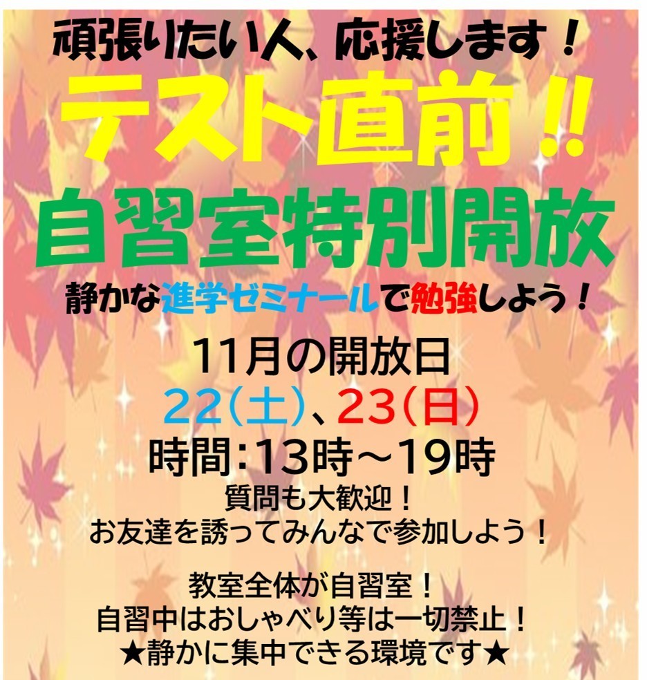 🔵この中間テストでは進ゼミ生以外の方でも自習室が使える「自習室開放日」があります!