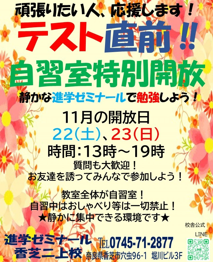 🔵この中間テストでは進ゼミ生以外の方でも自習室が使える「自習室開放日」があります!