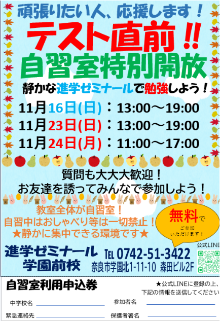 そして今なら、定期テスト直前の自習室無料開放を実施中!!