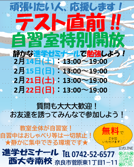【進学ゼミナール西大寺南校】学年末テスト自習室 無料開放⭐