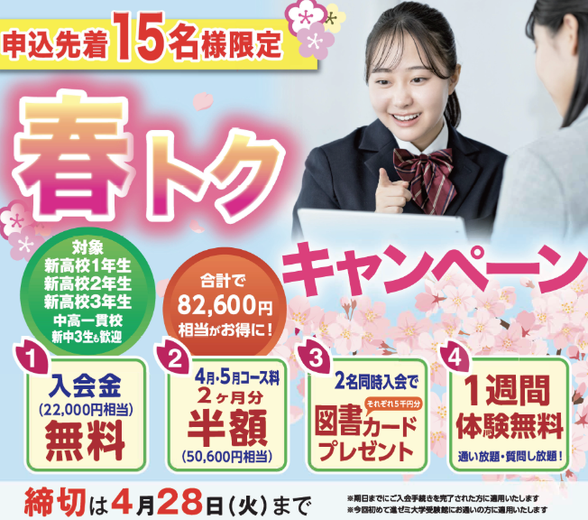 進学ゼミナールでは、新学年のスタートダッシュを応援するためのお得なキャンペーンをご用意させていただいております。ぜひこのキャンペーンをご利用くださいませ!