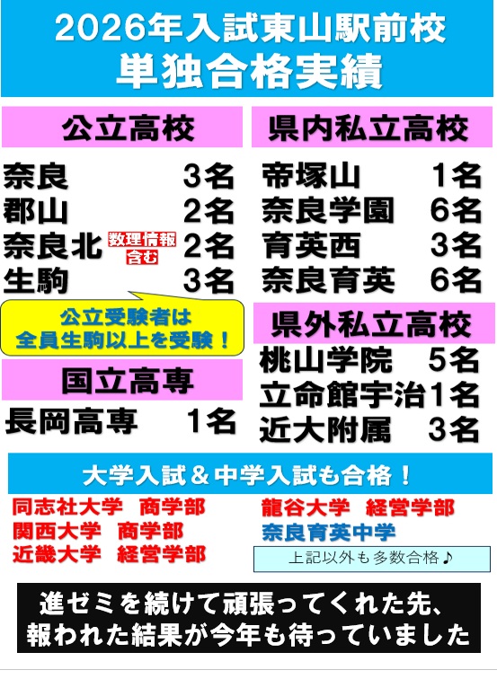 東山駅前校では公立受験生の全員が生駒高校以上を受験!!