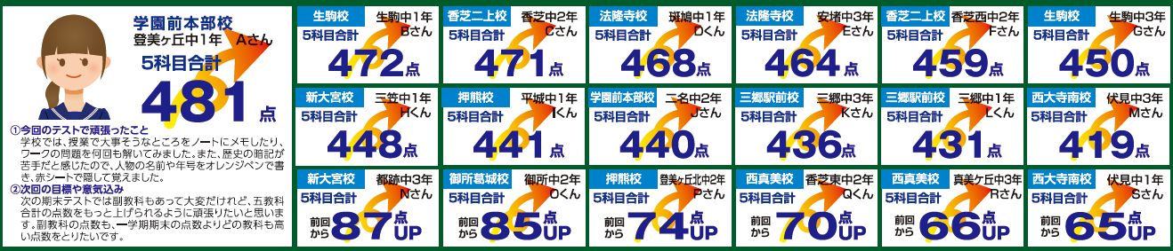 東山駅前校 平群中3年 E.Yくん 5科目合計 470点