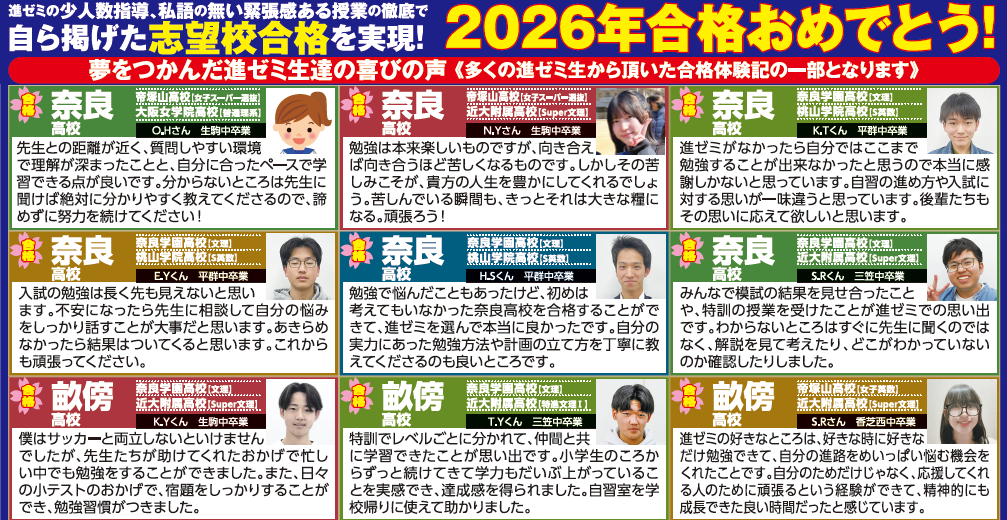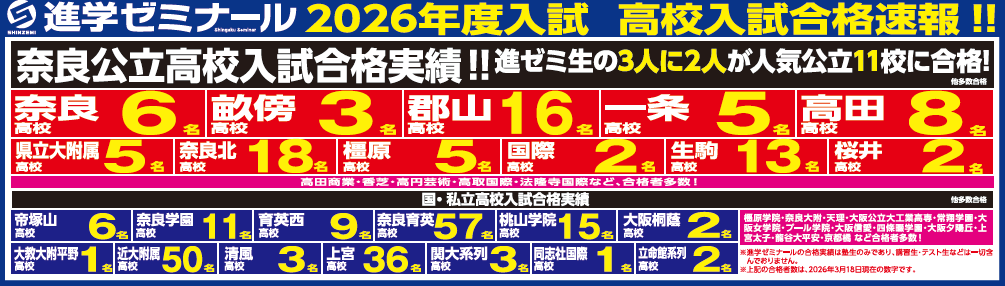 過去3年間、奈良高校・畝傍高校・郡山高校の合格者61名の進学ゼミナールへの入会時平均偏差値は56.7。入会時から合格基準の偏差値を満たしているものはほとんどいませんでした。この状況から生徒たちが志望校合格という高い目標を掲げ、努力を積み重ねた結果、大幅偏差値アップと合格をつかみ取りました!!