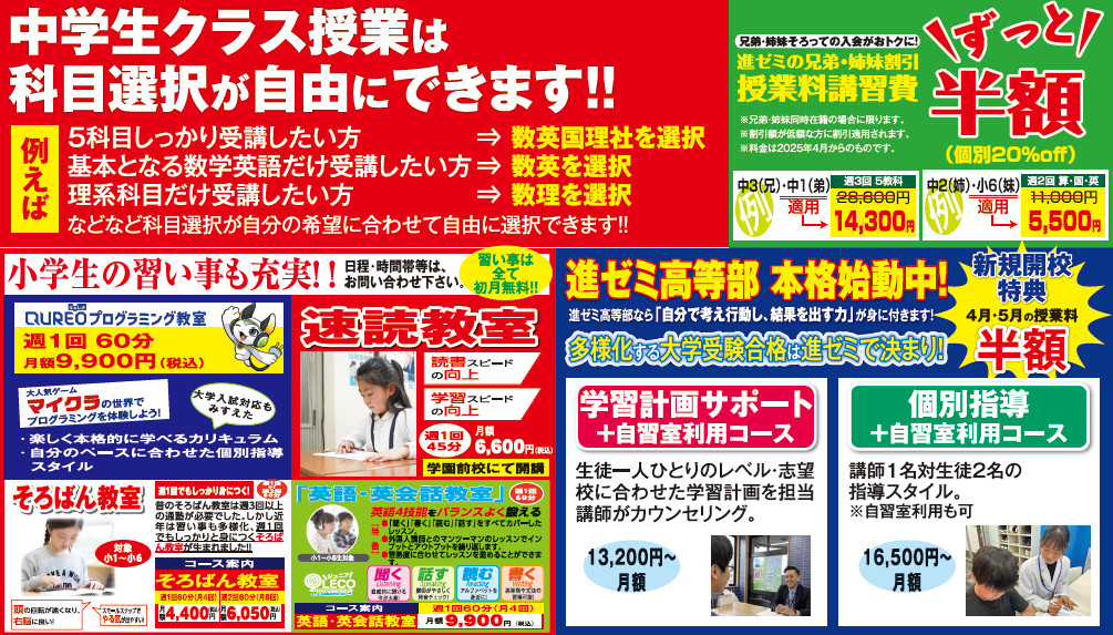 進学ゼミナールはお子様の目的・目標に合わせた受講が可能な塾です!