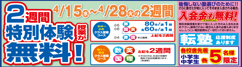小学生・中学生・高校生 各校舎先着 各5名様ずつ限定