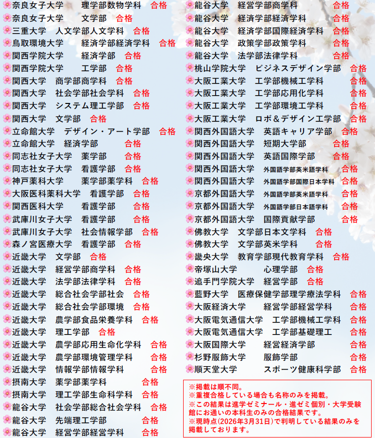 奈良北・橿原・国際・生駒・桜井・高田商業など合格者多数